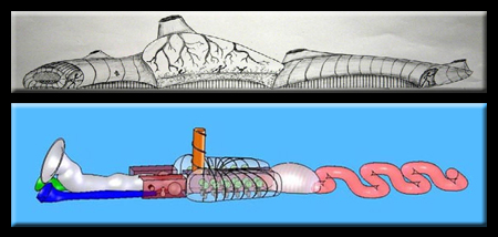 The Mechabolic will encase these hybrid bio-machine organs in a giant "dinosaur slug" trash scavenging creature- a creature which slithers across the desert in search of waste biomass trash to feed/fuel itself. All ingested trash will be converted to clean biomass foods/fuels using the simple technologies of gasification, anerobic digestion and Fischer Tropsch liquification. The Mechabolic will re-ingest the resulting foods/fuels to power its own locomotion as well as as a variety of high altitude fire effects.